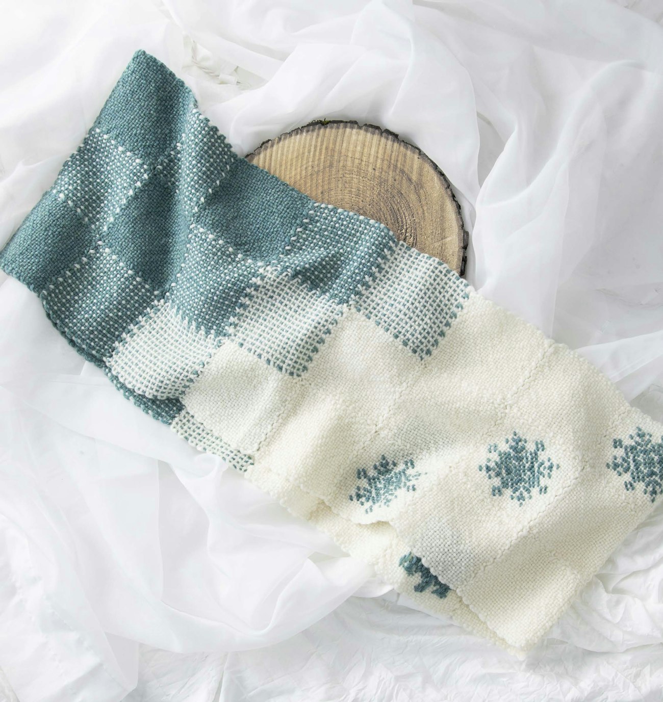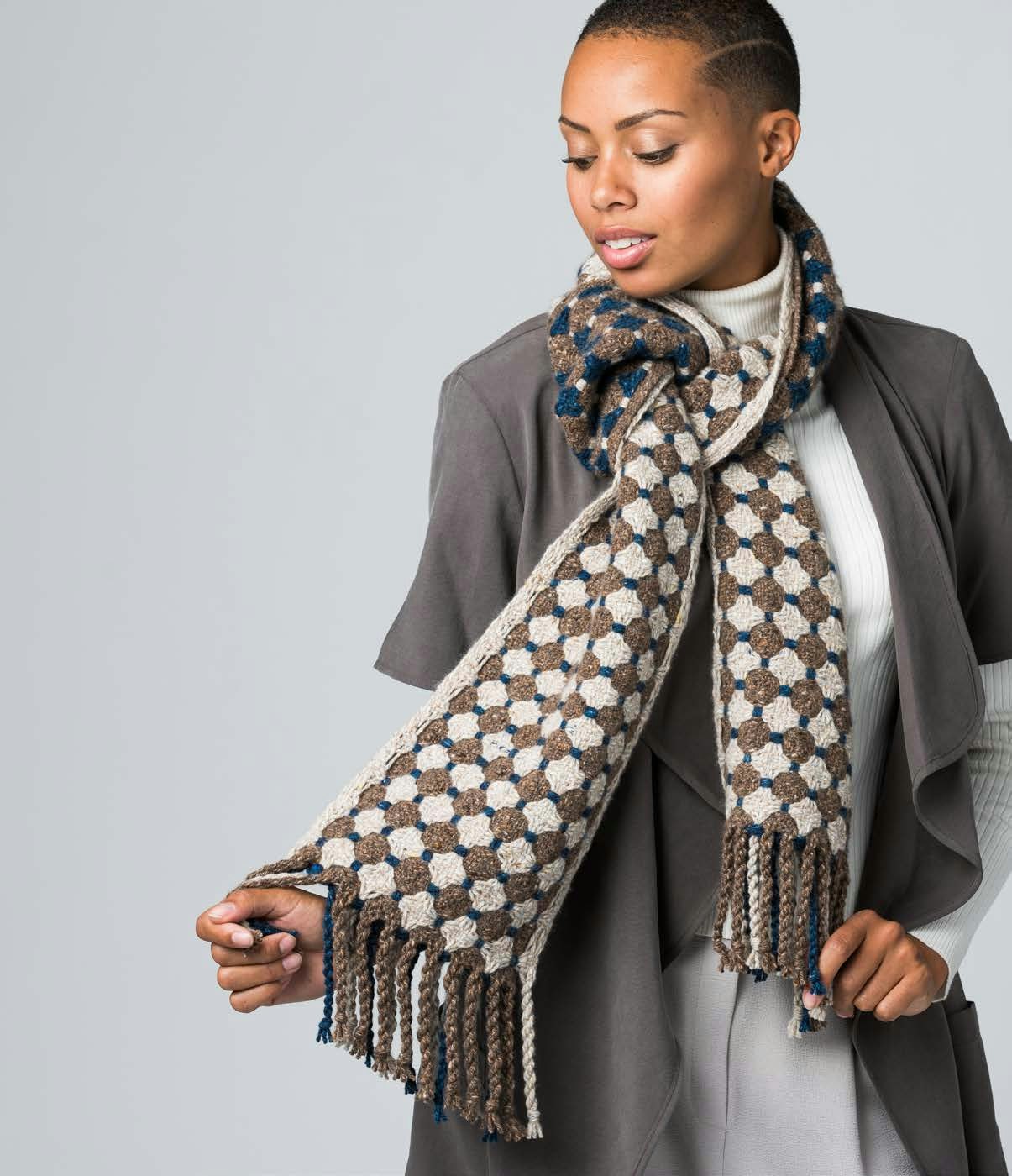 You don’t have to be a quilter to appreciate the striking geometric patterning in this pin-loom-woven scarf. It is sure to keep you warm—and fashionable—as you wear it around town on a cold winter’s day.