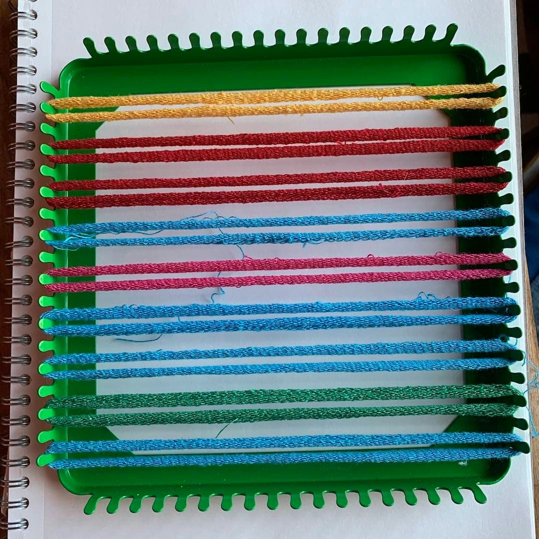 Step 1. Warp the loom. I warped the loom dutifully skipping every other tooth. (I did not take photos of the process when I wove the actual mug rugs so these photos show the loom with a random assortment of leftover loops.)