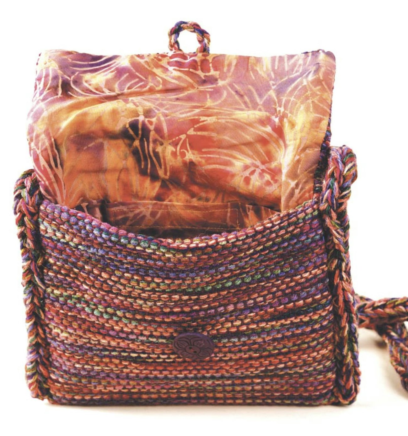 While searching through hidden gems of Handwoven, I saw this incredible rigid-heddle-woven shoulder bag by Barbara Nielsen. When designing her bag, Barbara picked out her lining fabric first and then used that to determine her weft colors for the rest of the bag.