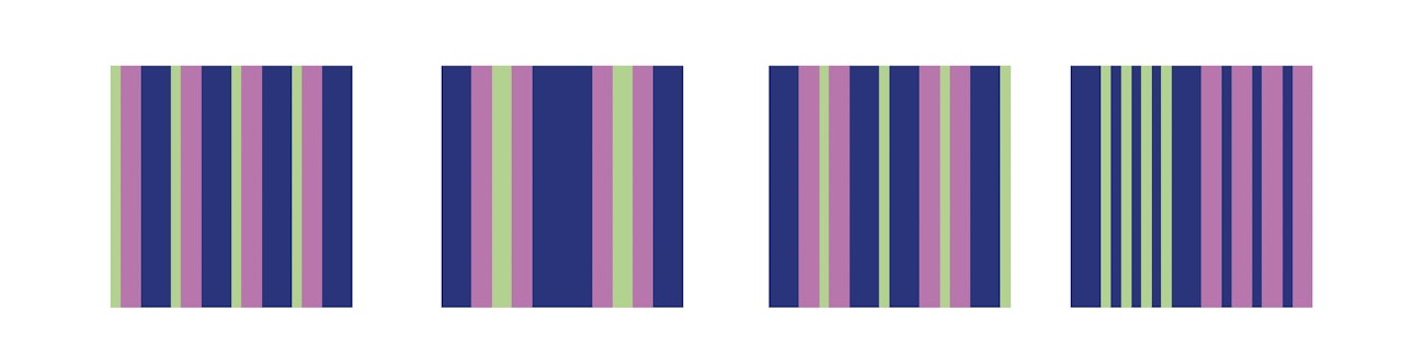 Once you’ve chosen your trio of colors, build your warp stripes using the 1:2:3 proportions as a guide. Above are just a few examples—you can make the stripes regular or random. If you run out of a color, simply swap in any other color of the same value. In other words, if you run out of Light, use another Light color with the same true value as the original.