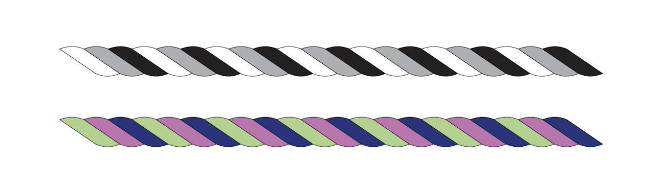 For her LMD123 method, Jennifer begins by choosing three colors with a clear step between values and twisting them together. Whether you’re using a neutral palette, like the twist at the top of the image, or a more colorful one, like the one at the bottom, the contrast in value should be obvious.