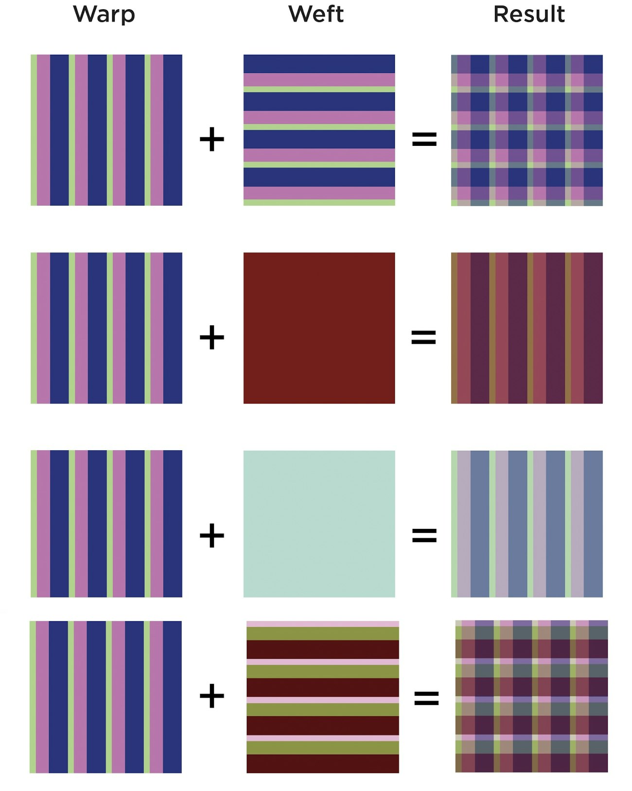 From left to right: warp stripes, weft color or colors, and final result.