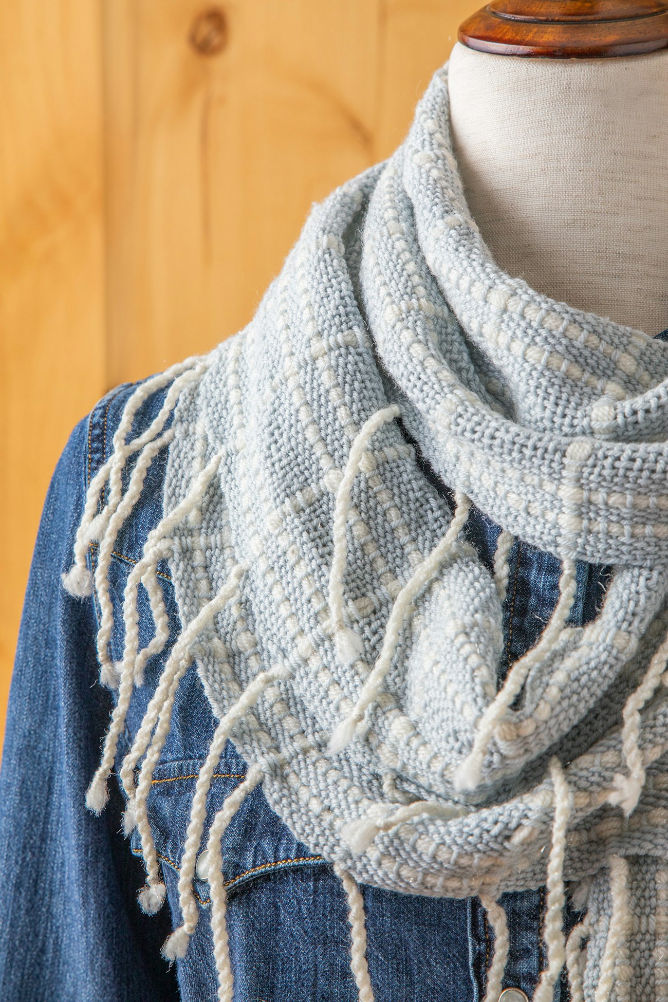 Thick yarns, crammed dents, and just a 7-inch weaving width make this an extra quick and easy rigid-heddle project. Don’t want to deal with the side fringe? Weave the project as a straight plaid scarf or even skip the crammed weft picks and weave a striped scarf instead. Easy peasy!