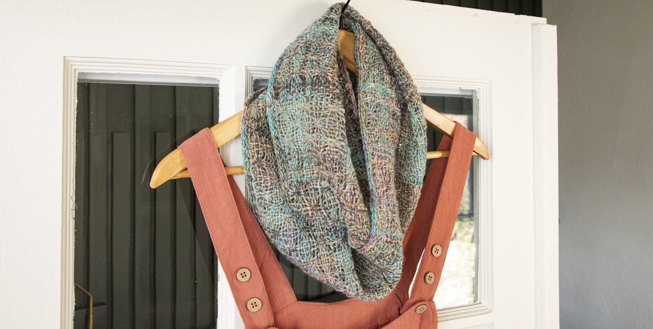 Angela Tong wove her Infinite Lace Cowl using a spot Bronson pin-loom pick-up pattern. Photo by Matt Graves