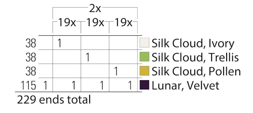 Reading the warp color order from right to left, there are two tiers of brackets: three lower brackets labeled as 19x (meaning you repeat the threading in those areas 19 times) and a higher bracket that encompasses all three of the lower brackets labeled 2x (meaning you’ll repeat those lower brackets in order twice.)