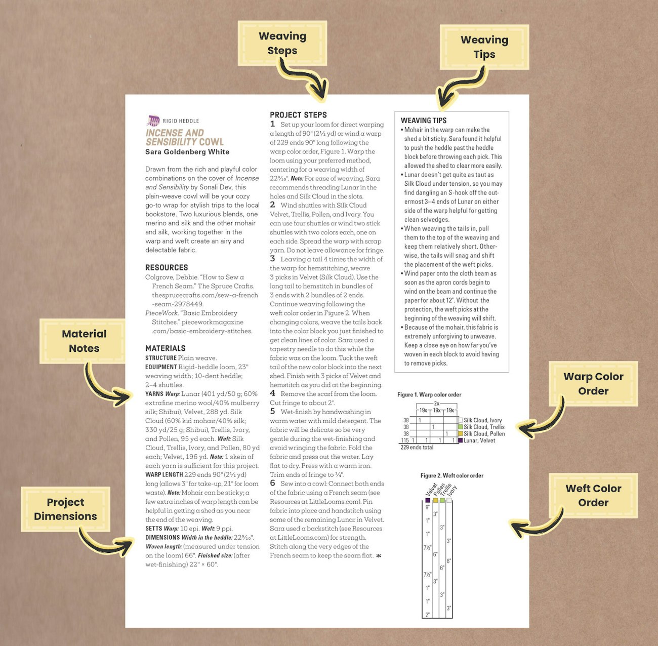 After you’ve learned how to warp and weave on your rigid-heddle loom, the next step is to learn how to weave a basic weaving pattern. In the patterns in Little Looms, like the one you can see below, you'll find information about what materials you need to weave the project; the size of the project on the loom and after finishing; step-by-step instructions to walk you through warping, weaving, and finishing; tips from the designer; and sometimes there will also be different charts and figures.