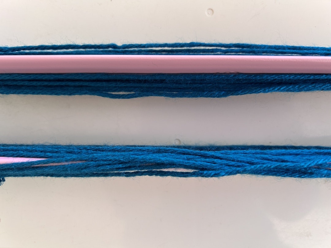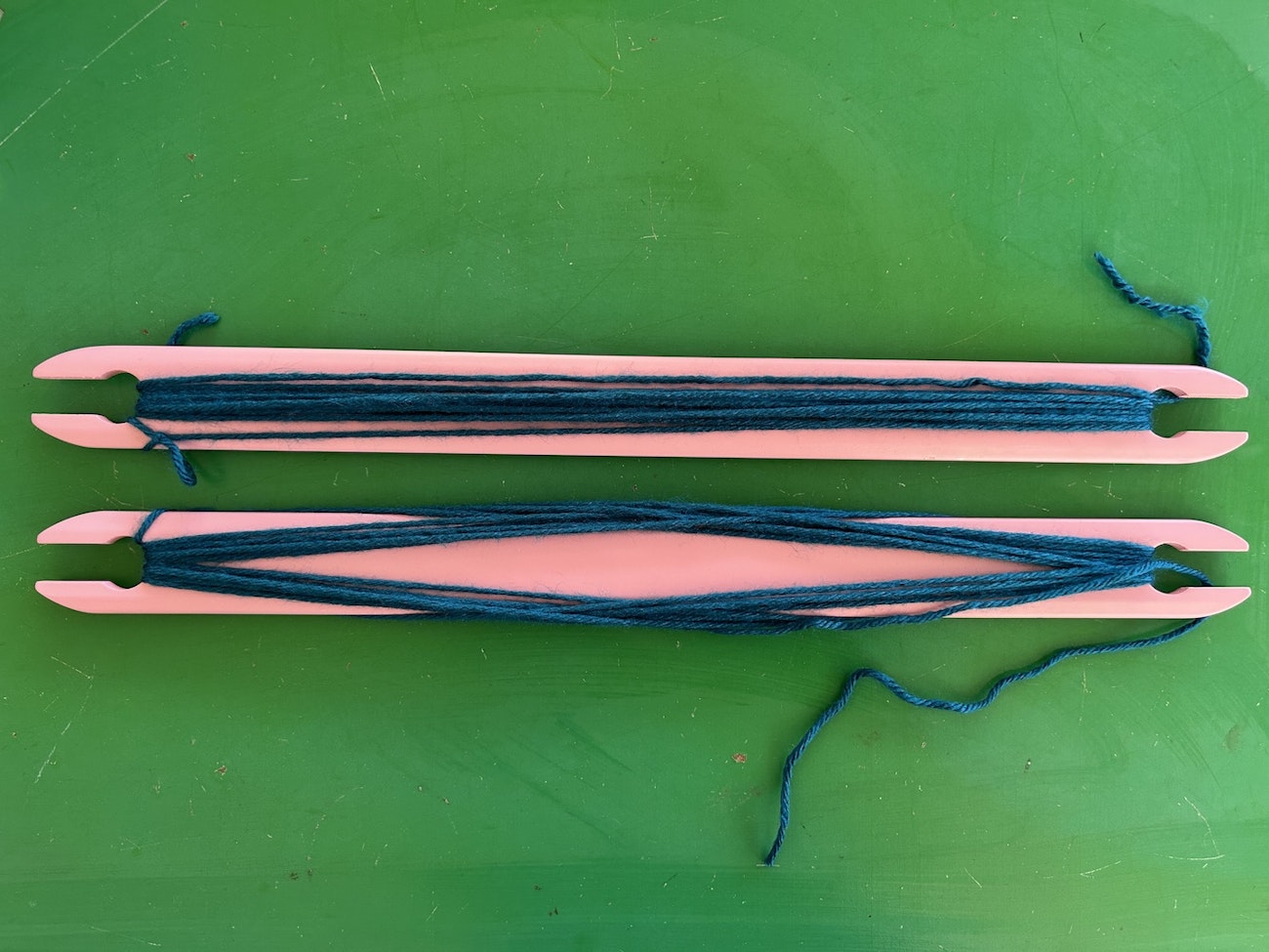 Don’t believe me? The photo above shows two stick shuttles, each with 20 winds of the same yarn. One I wound using the around method, one using the figure-eight method. As you can see, with the around method all the yarn is wound together in the middle of the shuttle giving the shuttle a higher profile. Conversely, with the figure-eight method, the same amount of yarn is split along each side.