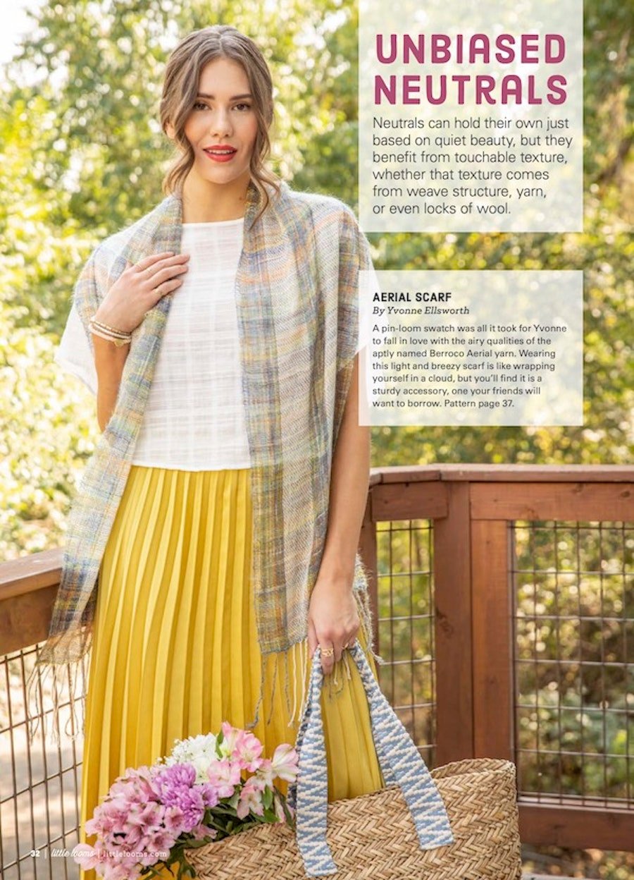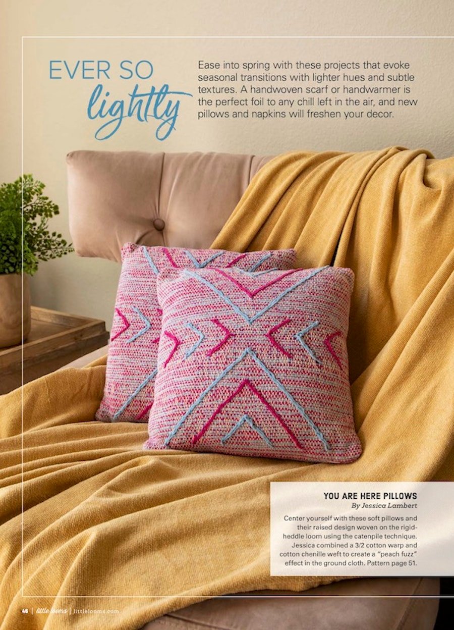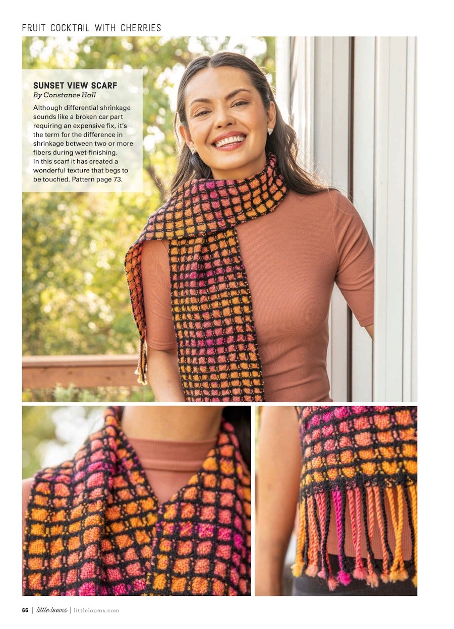 Login Purchase Single ProductWhen a fellow weaver can’t help but touch your handwoven scarf, shawl, or other project, it’s known as the weaver’s handshake. In this issue you’ll find projects with all kinds of tempting textures that other weavers won’t be able to leave alone. Among the 21 projects featured in the issue, you’ll find tea towels woven with bouclé cotton, a colorful scarf with differential shrinkage, puffy embellished pin-loom and rigid-heddle pillows, and a traditional Icelandic wall hanging woven using unspun wool locks. If you’re looking to add some texture to a project you’ve already woven, you’ll also find an article on visible mending where you’ll learn how to use a darning loom.