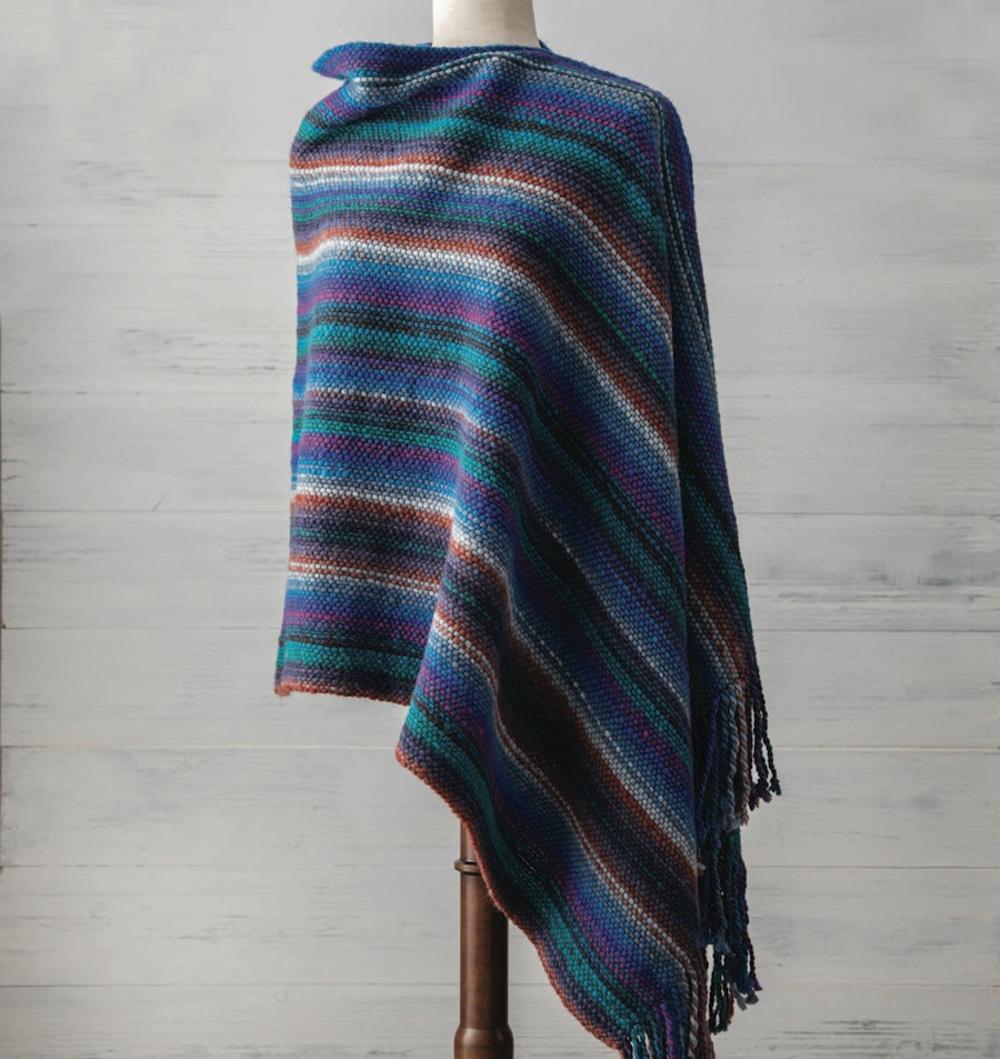 Plain weave allows the stunning colors of Noro yarn to take front and center in this striking poncho. The optional inkle band tucked inside adds a bit of hidden beauty and stabilizes the shoulder seam.