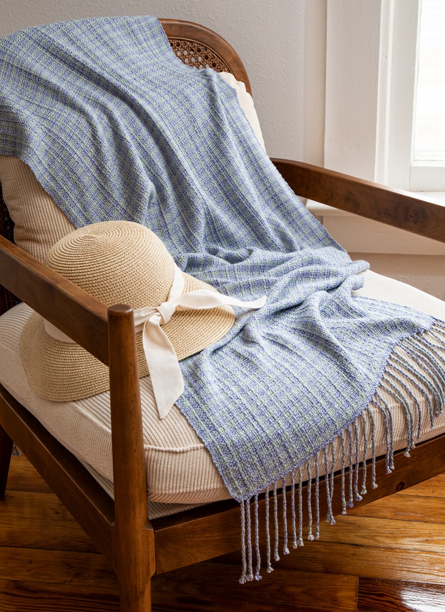 LoginWoven in a fresh summer palette of periwinkle, silver, and cactus, this bamboo and cotton shawl has the perfect blend of softness, texture, and drape. The thin warp stripes let the colors shift gently across the scarf, giving it a soft rhythm and a bit of movement.