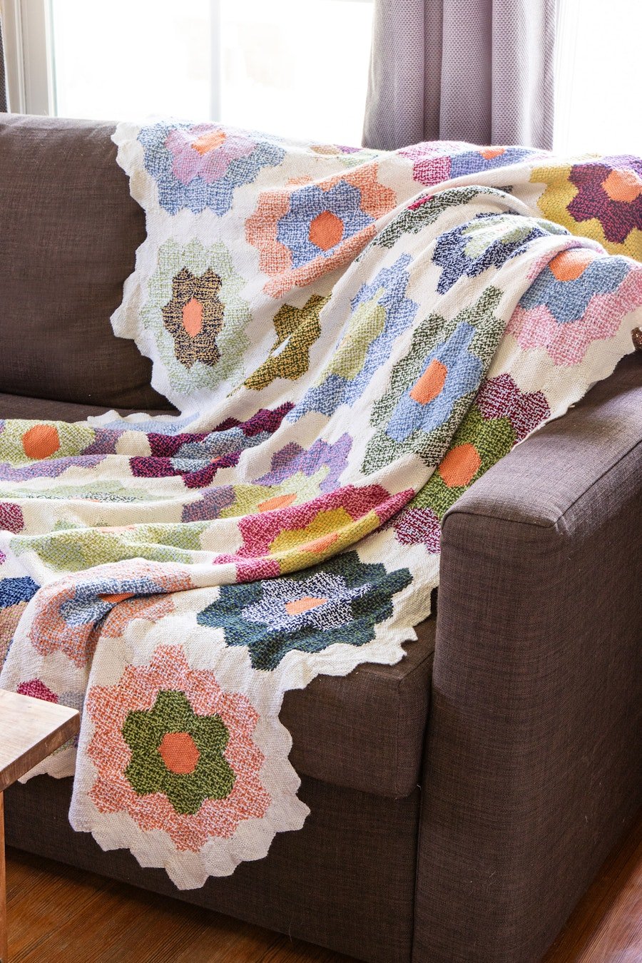 LoginGabi’s daughter took her first weaving lessons from a teacher named Charlotte. While at a lesson, Gabi noticed Charlotte’s beautiful heirloom quilt in the classic Grandmother’s Flower Garden design and made from Depression-era flour sacks. Gabi’s version of that quilt is created with cotton pin-loom hexagons.
