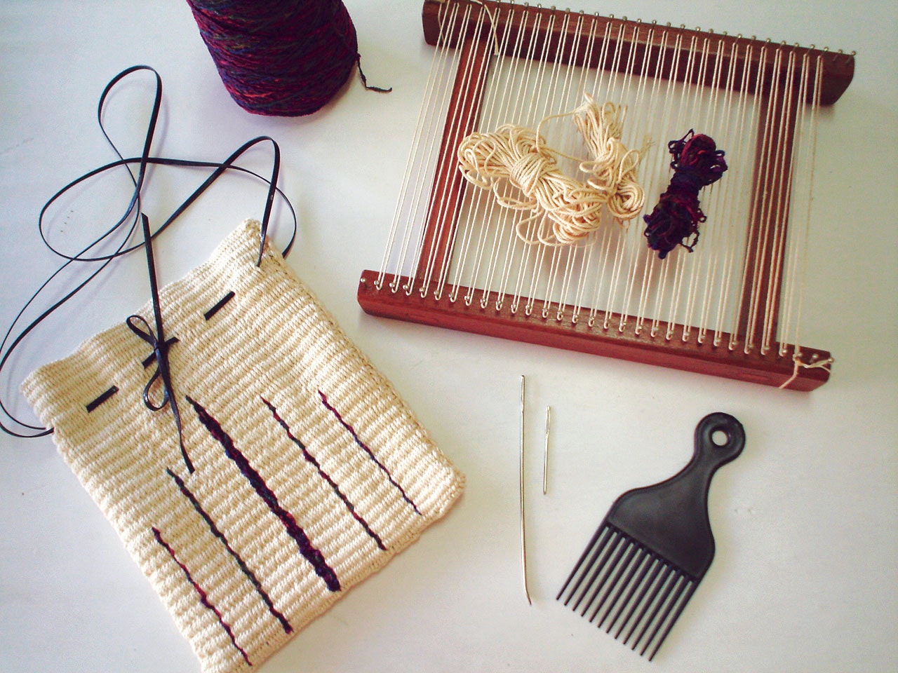 The Drawstring Shoulder Bag and the tools Marie used to weave it, including what she describes as a peg loom.