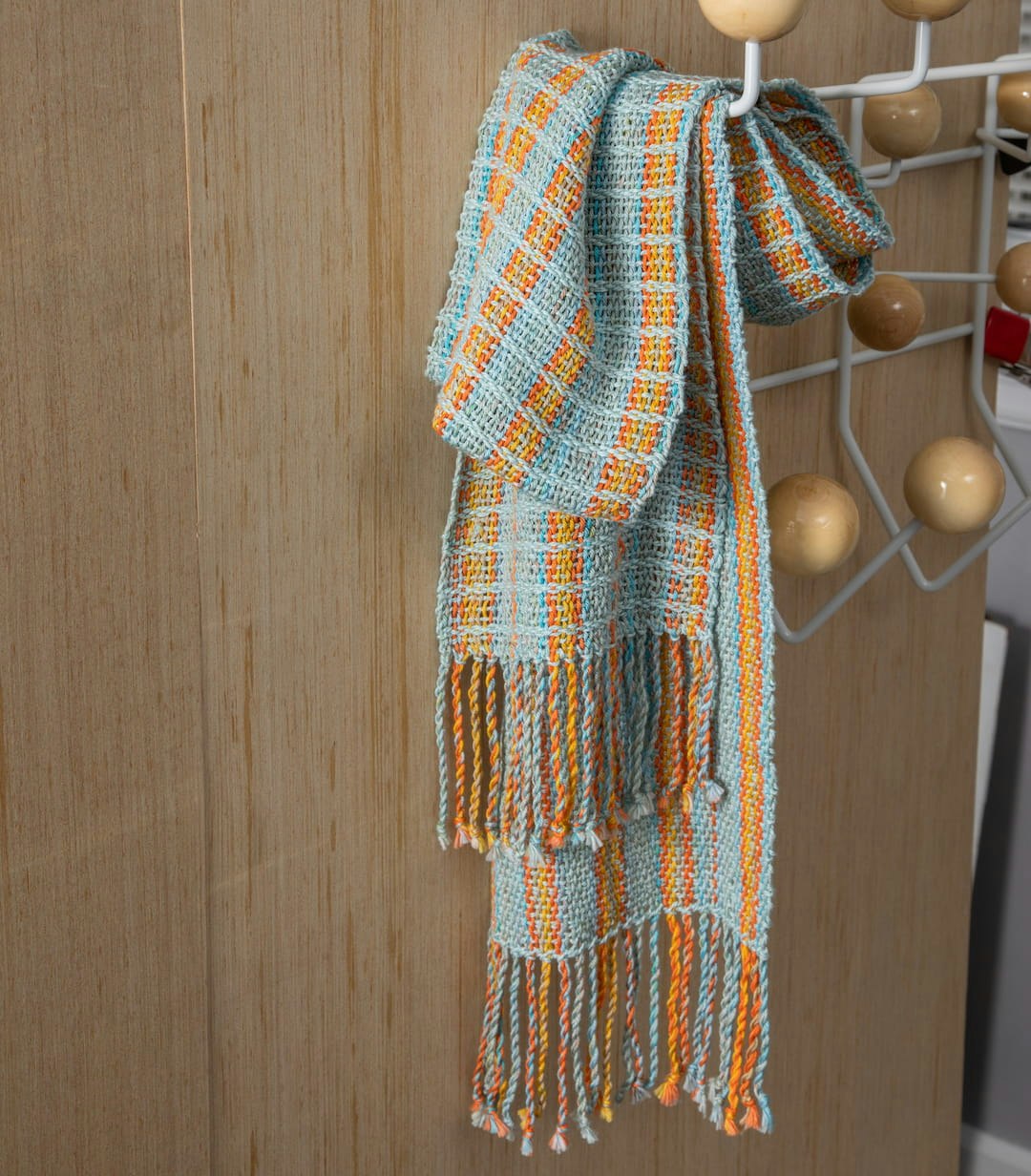 The second pattern I chose is Carla Hubbart’s Wrap Me In Houndstooth (featured at top). Originally published in Handwoven May/June 2021, this houndstooth wrap is bright and beautiful. Carla uses color beautifully to create a color-and-weave design that looks complicated but is actually simple plain weave. It’s such a good example of how a cleverly planned warp or weft color order can create something spectacular.