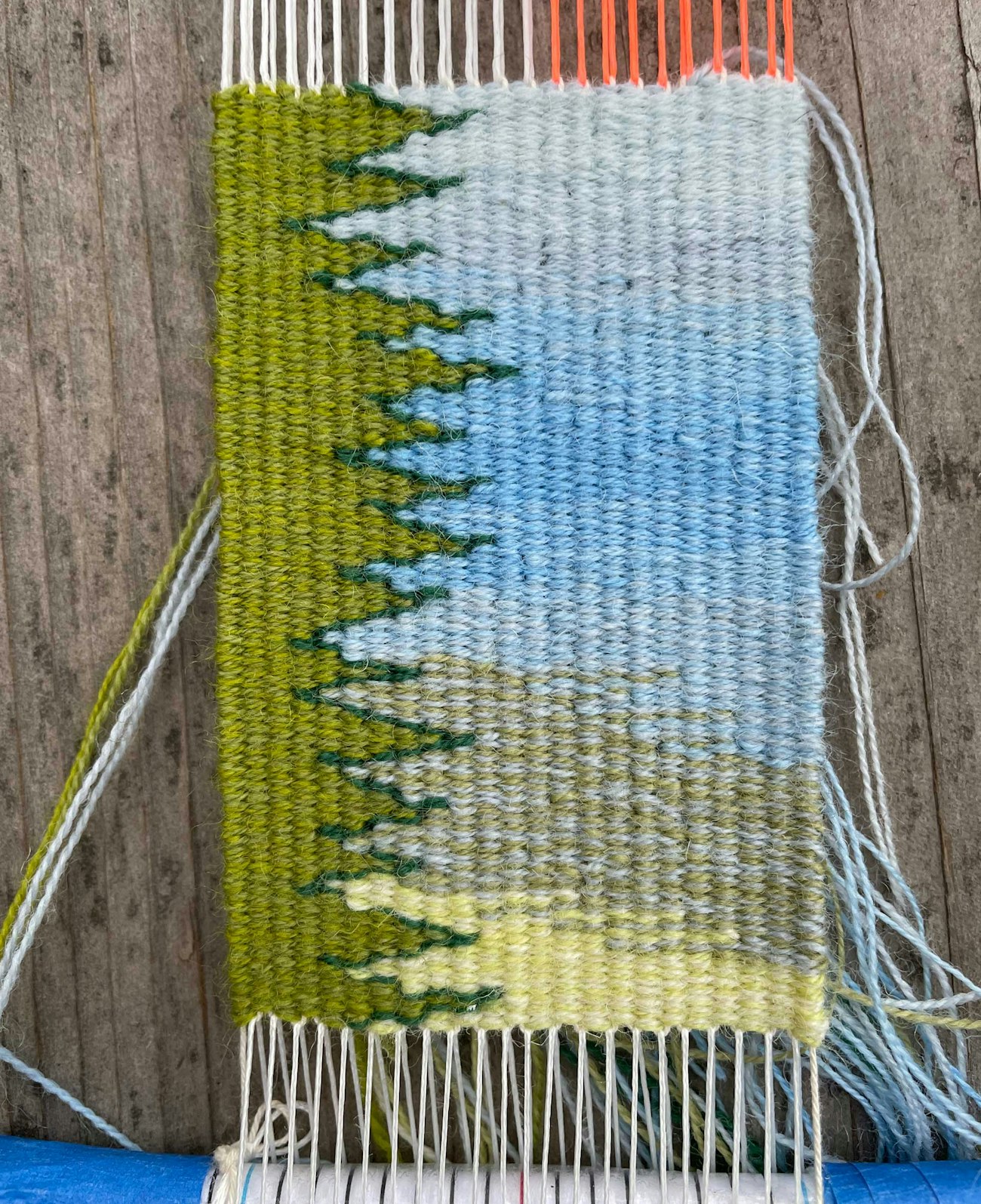 The finished Twin Lakes tapestry is 2" × 3" woven with weaversbazaar 18/2 wool at 12 epi on a fringeless four-selvedge warp.