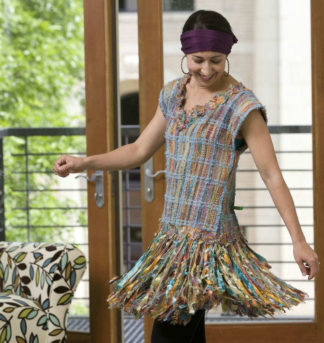 I’m not sure when it was that I first worked with Sara Goldenberg White on something for Handwoven, but I’m pretty sure it was the Raveling Plaid Dress from the September/October 2012 “fashion” issue. Most of the other designers submitted proposals for projects that were fairly incredible but also fairly traditional. Sara’s dress, on the other hand, was a wild and wonderful rigid-heddle-woven dress where the skirt was comprised of hundreds of free-flowing novelty and ribbon yarns. It was unlike anything I’d seen in my year at Handwoven, and I knew immediately that this Sara was my kind of person.