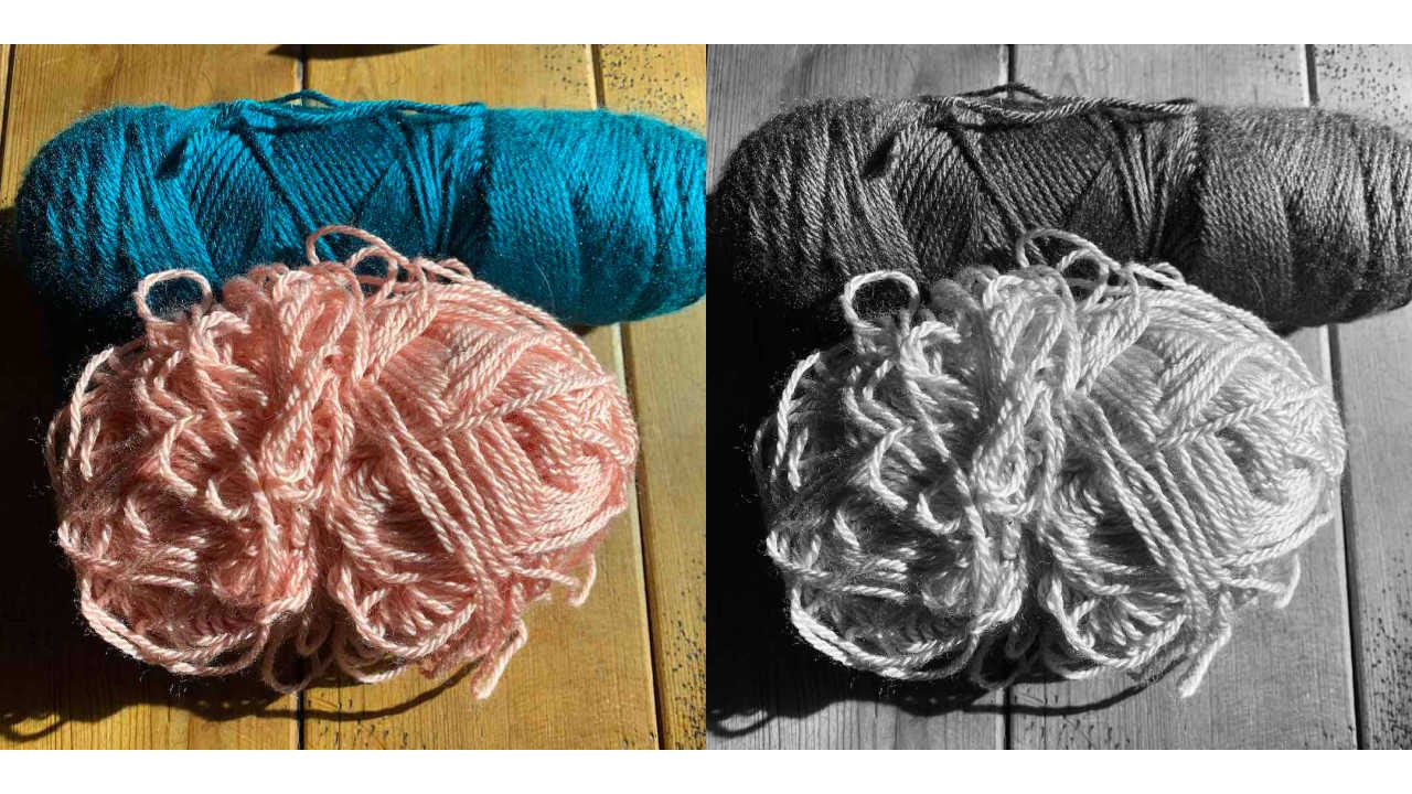 When viewed in gray scale the blue and green yarns are suddenly all but indistinguishable.
