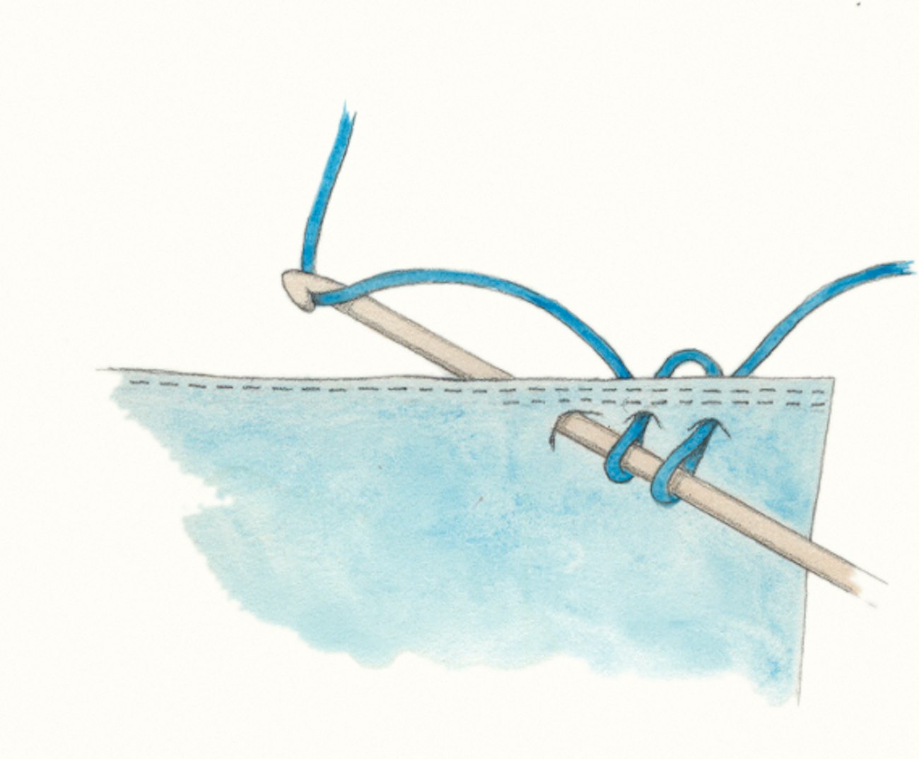 Use a crochet hook to pick up your first row of stitches for adding knitted trims directly to the fabric edges. Use a crochet hook the same size as the knitting needles. Start on the right edge of the fabric with the right side of the fabric facing you. Where you want your first loop to be, insert the crochet hook into the fabric from front to back, below the double row of machine stitching, as seen in the illustation above. Hook the yarn from behind the fabric and pull it to the front to create a loop. Insert the hook where you want your next loop to be and repeat. Hook an inch or so of loops, being careful to maintain the appropriate number of stitches per inch. Then transfer the loops from the back handle of the hook onto a knitting needle. Continue hooking the yarn through the fabric and transferring stitches to the knitting needle until you have cast on all your loops. Note that the stitches will be backward on your knitting needle. You may choose to correct this or leave them twisted. (Heather finds twisted stitches result in a stable fabric with an increased elasticity.)