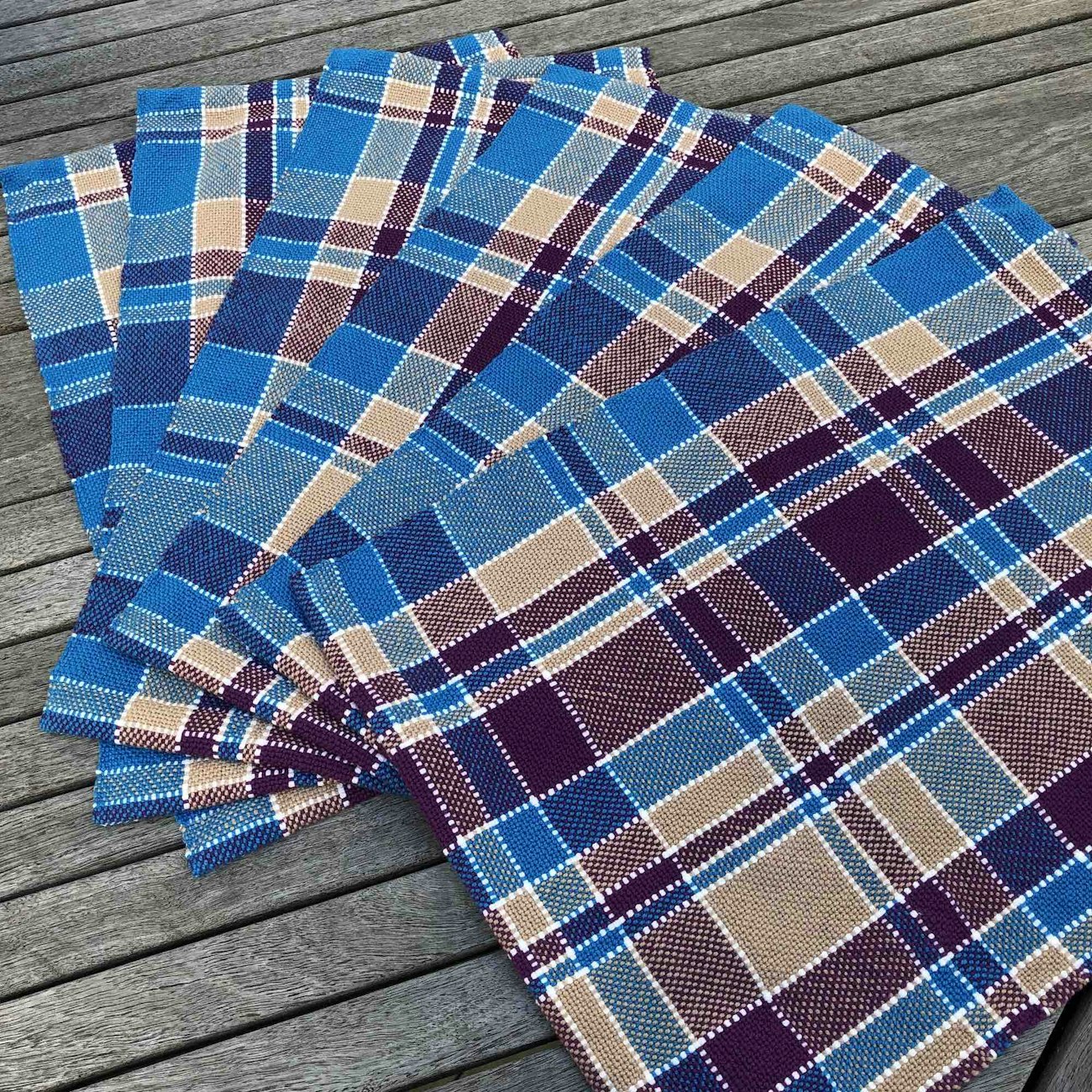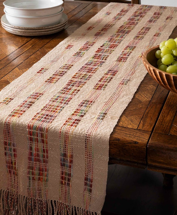 There’s no rule that says you must use the Fibonacci numbers in order, either. For the placemats shown above, I used six numbers (1, 2, 3, 5, 8, and 13) doubled as loops in the threading sequence over four colors (white, turquoise, light brown, and purple). However, I also assigned white as a single loop between each of the other colors, making the final sequence 2, 1, 3, 1, 5, 1, 8, 1, 13, 1 . . . with each color except for white threaded with a different number of ends over the course of the warp.
