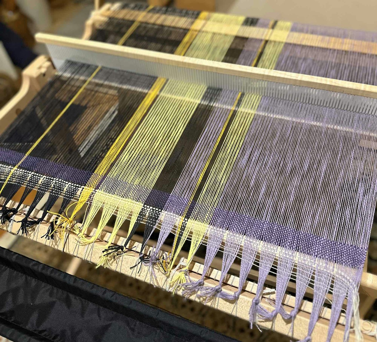The color order for this warp was somewhat random, based on how much of each color I had available and, honestly, which colors I thought looked better next to each other on the loom. I used Fibonacci numbers to determine the width of the stripes: 34, 2, 55, 8, 2, 34, 13, 13, 2, 13, 89 (ends, not loops).