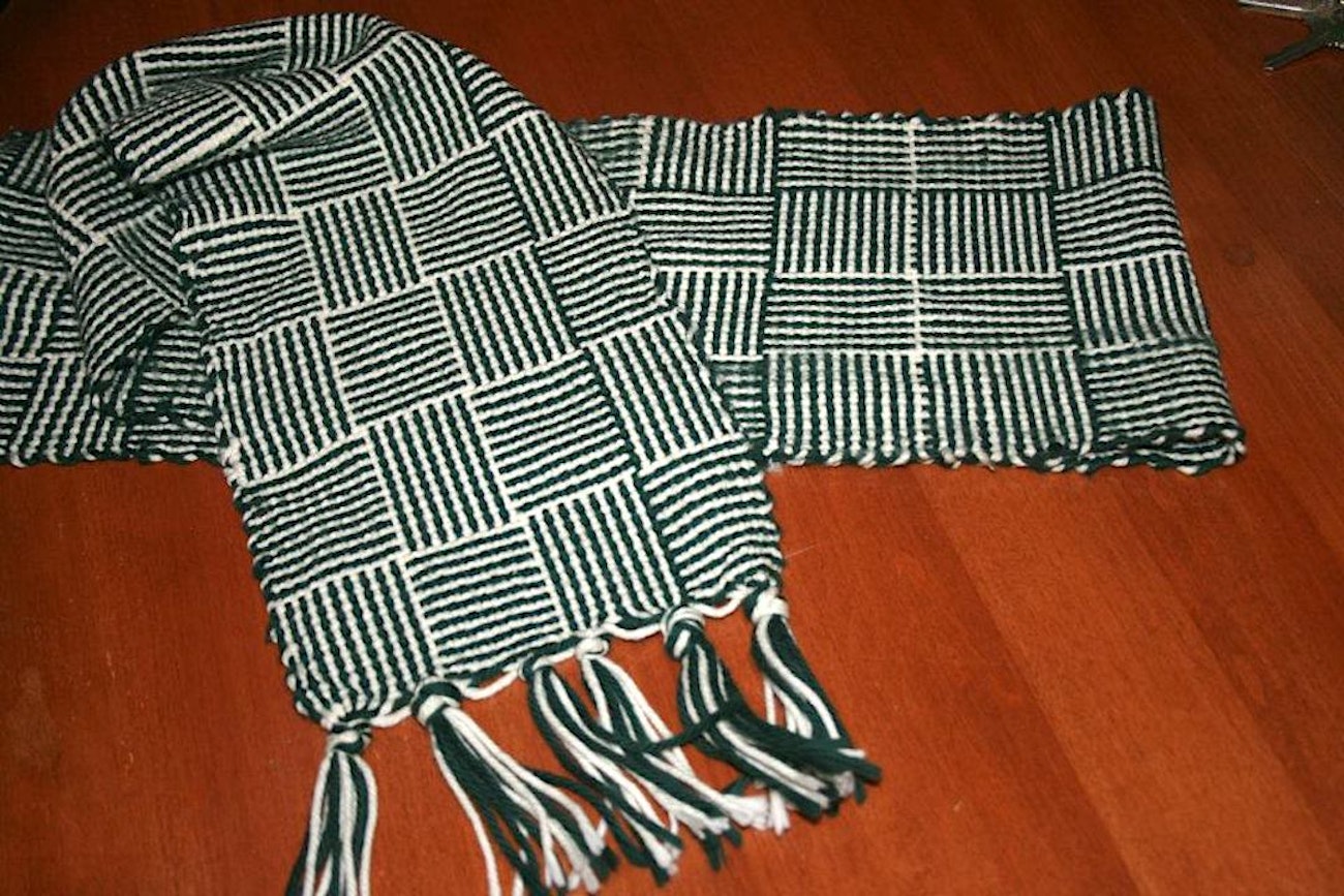 Later, it had me thinking about when I was new to weaving. My first rigid-heddle project was a log cabin scarf woven in green and white cotton.