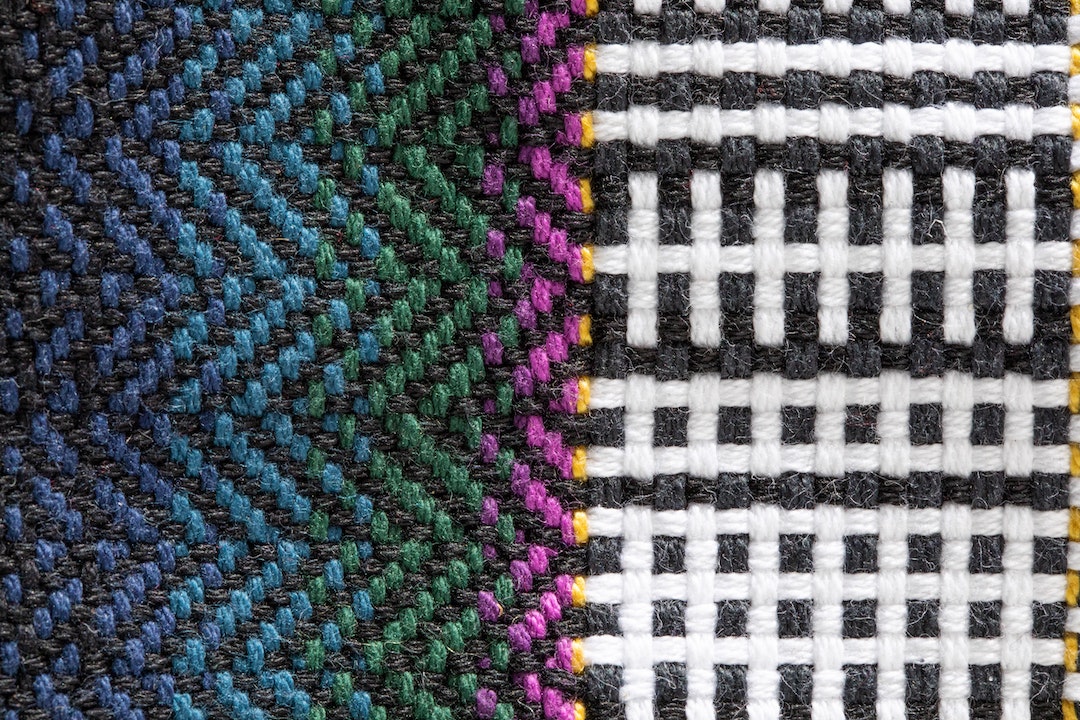 While this cloth was woven on a multi-shaft loom, it’s a great example of combining both methods of clasped-weft weaving. For her Light Sussex Color-and-Weave purse in Handwoven, May/June 2023, Alison Irwin overlaped the clasped weft for a few inches before pulling it out of the warp, beating, changing the shed, and then pulling it back through and out toward the selvedges.