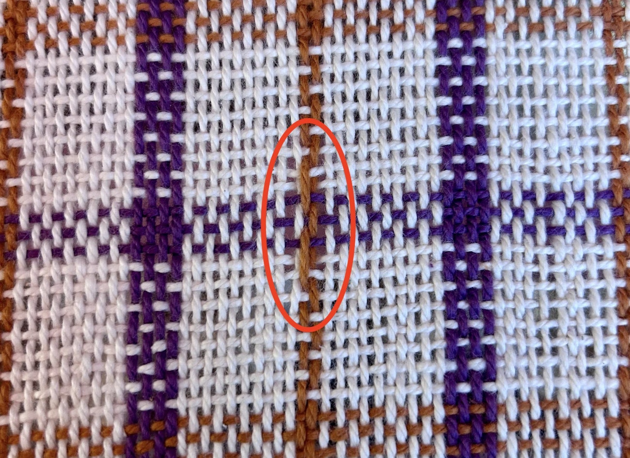 In the red oval, you can see two warp floats in a sea of plain weave. Photos by Christina Garton