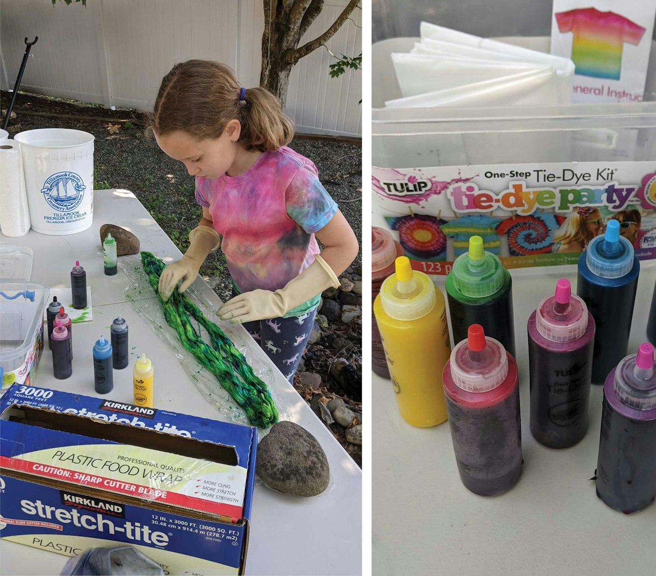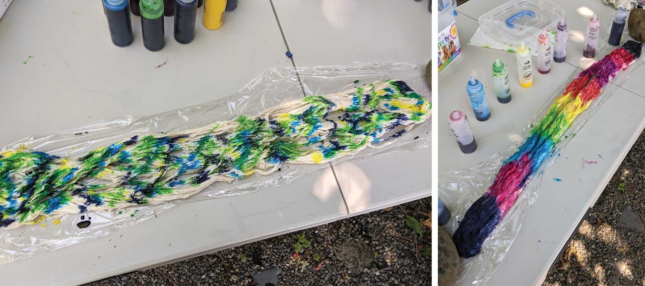 Left: Yarn dyeing parties are fun for all ages. Right: Bottles of dye filled and ready to go
