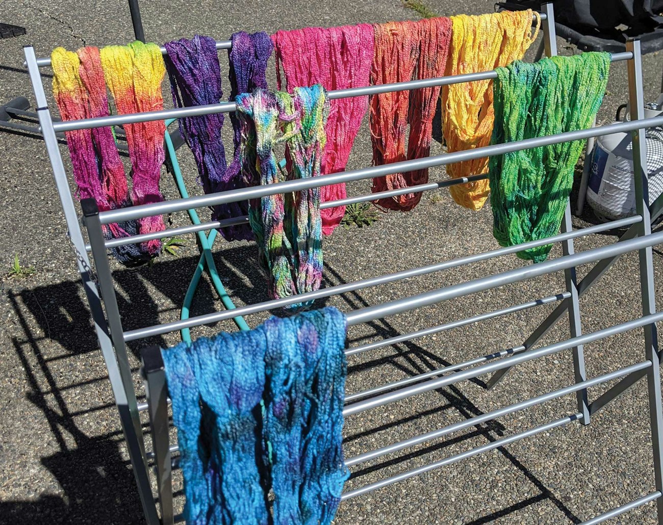 Hang the yarn to dry where drips won’t be a problem, such as outside on a laundry line or in a shower. The yarn may feel slightly stiff after drying. It typically softens up after being wound on a ball winder or a warping board.