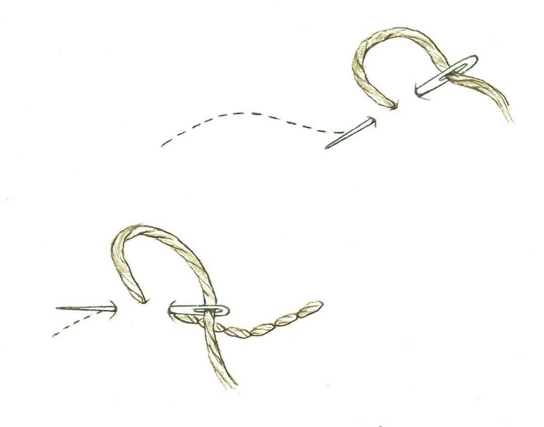 Pull the needle through the fabric The result is a straight stitch on top and a straight stitch on bottom, and your needle at the top of your fabric. For your next step, you’ll repeat this same process directly next to the straight stitch on top you just made. Continue on for your desired length. The result is a solid line of stitching that you can make straight or curve around as you wish. Back stitch is an excellent stitch for outlining shapes. It’s what Margaret used to outline the houses.