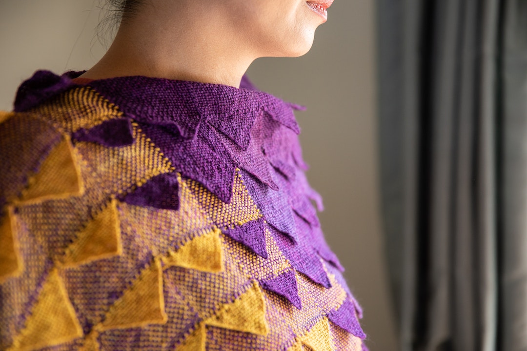 In this issue you’ll find crisp linens, including a set of napkins (see photo at top) woven using slub cotton in the warp and linen in the weft for a table-linen texture that cannot be beat. For her Feathered Poncho (above) made from pin-loom woven elongated hexagons, Greta Holmstrom not only used a lovely merino blend sock yarn, but she also constructed the poncho in such a way as to mimic feathers. So clever!