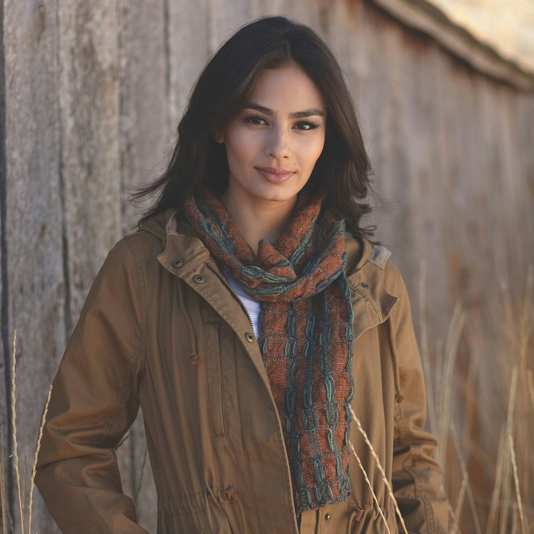 Stephanie Flynn Sokolov’s Copper Ray Scarf, with its reddish-brownish-orange framed by dusty green, looks like a forest in autumn as the leaves change color so any nearby pine trees pop out just that much more. Fabulous!