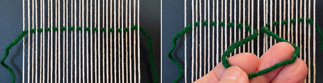 Left: Weft is placed across the shed in plain weave. Right: Weft is pulled up in a big loop between two warp ends.