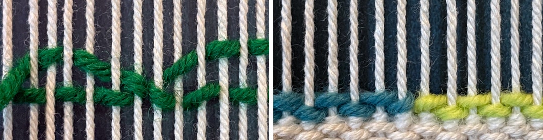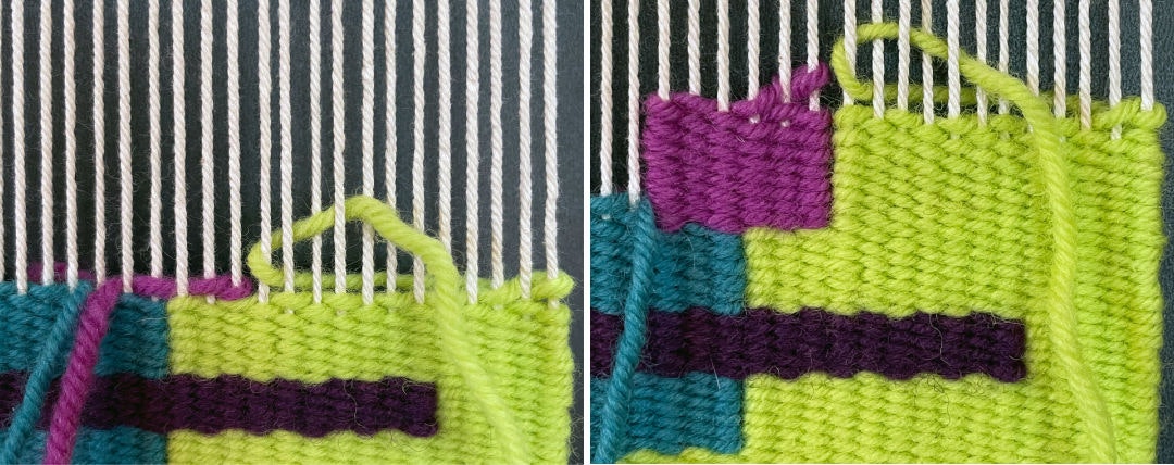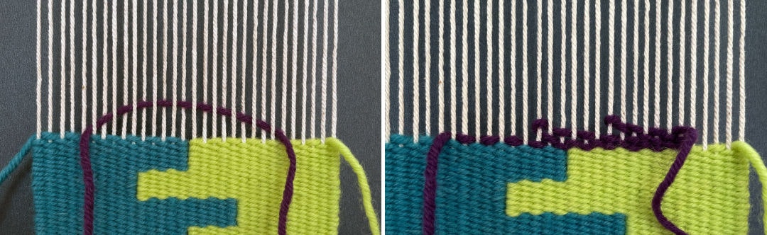 Another way to resolve the issue is to change the direction for one of the existing wefts. You can do that by snipping the weft off and securing the end, then restarting it at the opposite edge of the shape. This will allow one of the two original wefts to move opposite the newly inserted weft. Also, rather than snipping and restarting the weft, you could attach it and allow the weft to float across the back to the point where it will be reattached and reinserted, so it will be heading in the opposite direction (photos below). This float-across method works very well for a short distance of not more than a couple of inches. For a wider area, it’s best to clip off and reinsert. When ending the new shape, you can fasten off the weft at either side, but remember that one of the two original wefts will again have to change direction to be able to meet and separate correctly once more (photo below right).