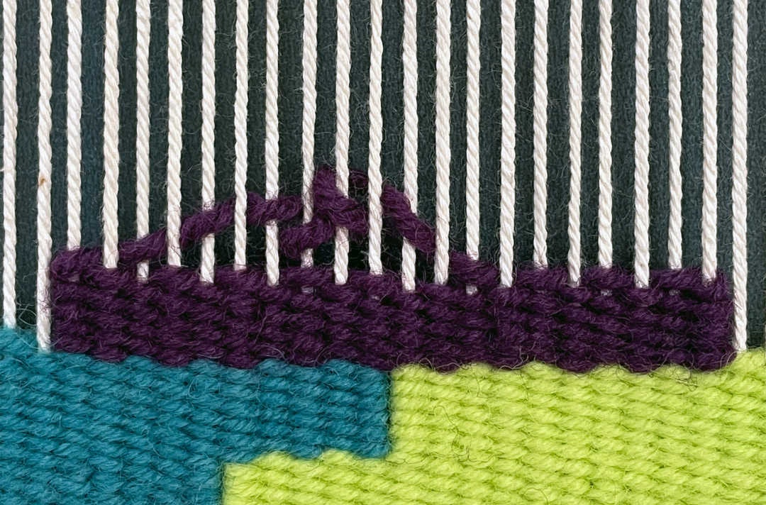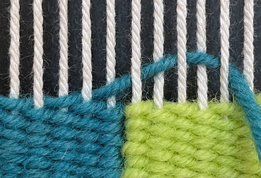 The advantage of meet and separate is that by having wefts traveling in opposite directions in the same shed, you can take either weft into the area where the other one has been woven in the previous pick without overlapping the two in the same shed (above photo). Overlapping doubles the weft thickness, making it difficult to pack the weaving well in that area, which will cause the warp ends to show. With meet and separate, you can either weave the tapestry by inserting wefts across each row as needed and packing them into place to keep the tapestry moving up a level, or you can build shapes independently and then fill in beside them, confident you’ll be able to figure out the correct shed to use at any given point.