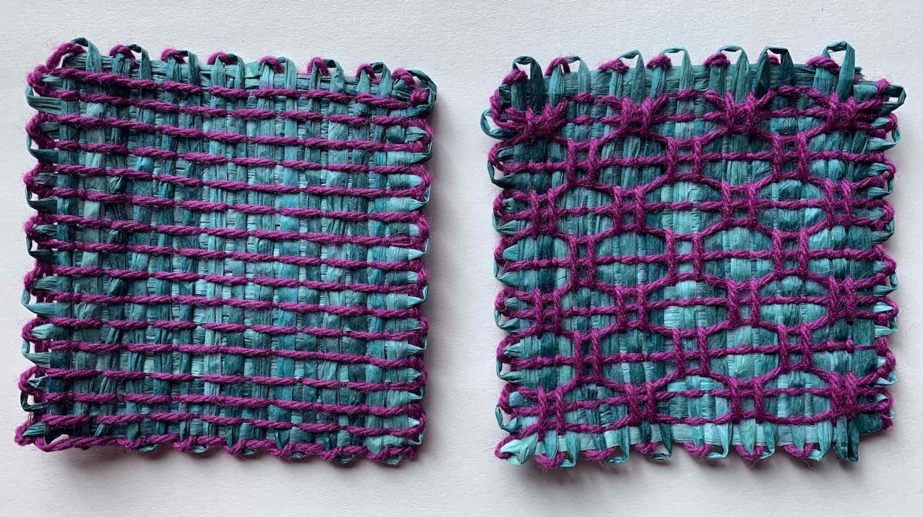 Both coasters woven with the berry wool blend with the basic weave on the left and the honeycomb on the right. Photo credit: Christina Garton